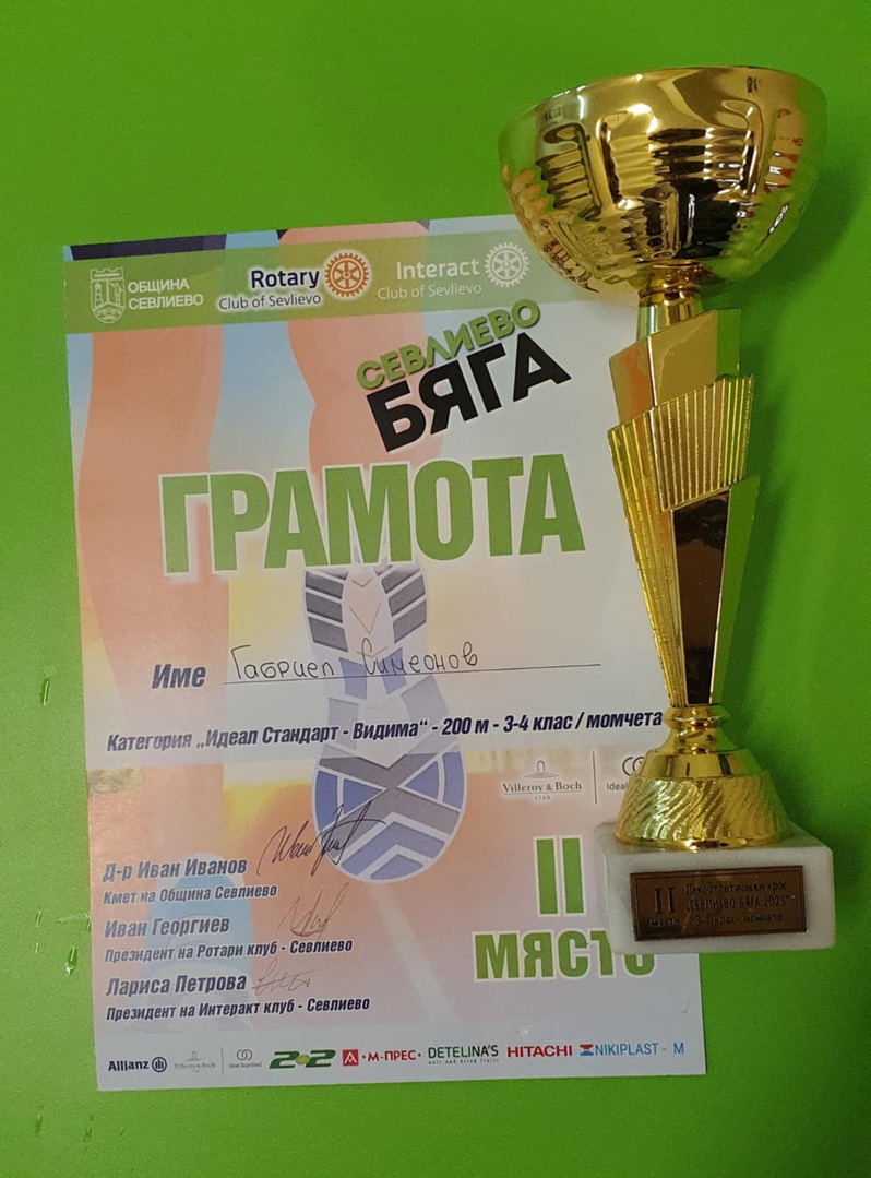 Второ място за Габриел от 3.а клас на лекоатлетическия крос, посветен на празниците на града „Севлиево бяга“. 🏃🏃‍♂️🏃🥈 Категория - 200м - 3. - 4.клас - момчета