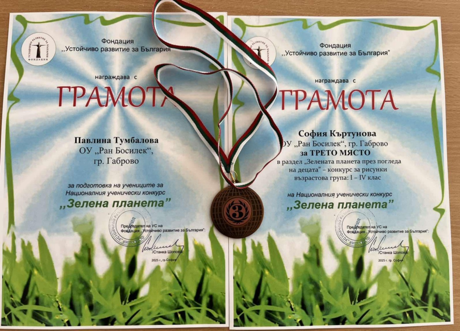 Успех за София Кирилова от 4 В. клас на ОУ „Ран Босилек“ – Габрово!  София Кирилова, ученичка от 4 В. клас, взе участие в Националния ученически конкурс на Фондация „Устойчиво развитие за България“. Нейната рисунка, озаглавена „Зелената планета“, бе отличена с грамота и медал за трето място. Творбата на София впечатли журито със своето виждане за един по-добър, чист и хармоничен свят, с любов към природата, нейното опазване и грижата за нея.  Поздравления, София! Продължавай да рисуваш света с цветове и вдъхновение!