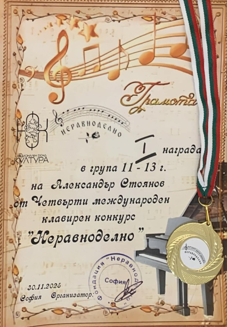 В периода 29. - 30.11.2025 год. в град София се проведе IV Международен клавирен конкурс "Неравноделно". Мисията на конкурса е да формира любов към българската музика , да предаде характерните музикални ценности в поколенията, за да се утвърди древното ни музикално наследство – фолклора. В него се включиха над 100 участници от различни възрастови групи. Ученикът Александър Стоянов от VI "а" клас с музикален педагог Весела Пенева се представи на високо ниво в трета възрастова група. Той спечели първа награда и златен медал за своите изпълнения.