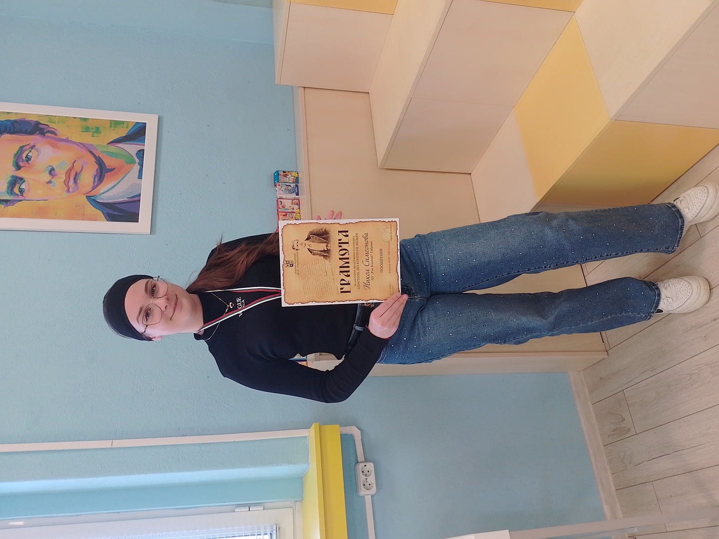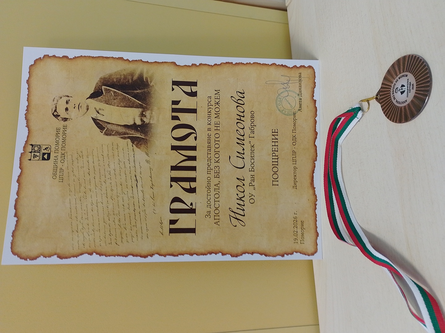 Никол Симеонова от 7. В клас със специална поощрителна награда от Националният конкурс "Апостола, без когото не можем."