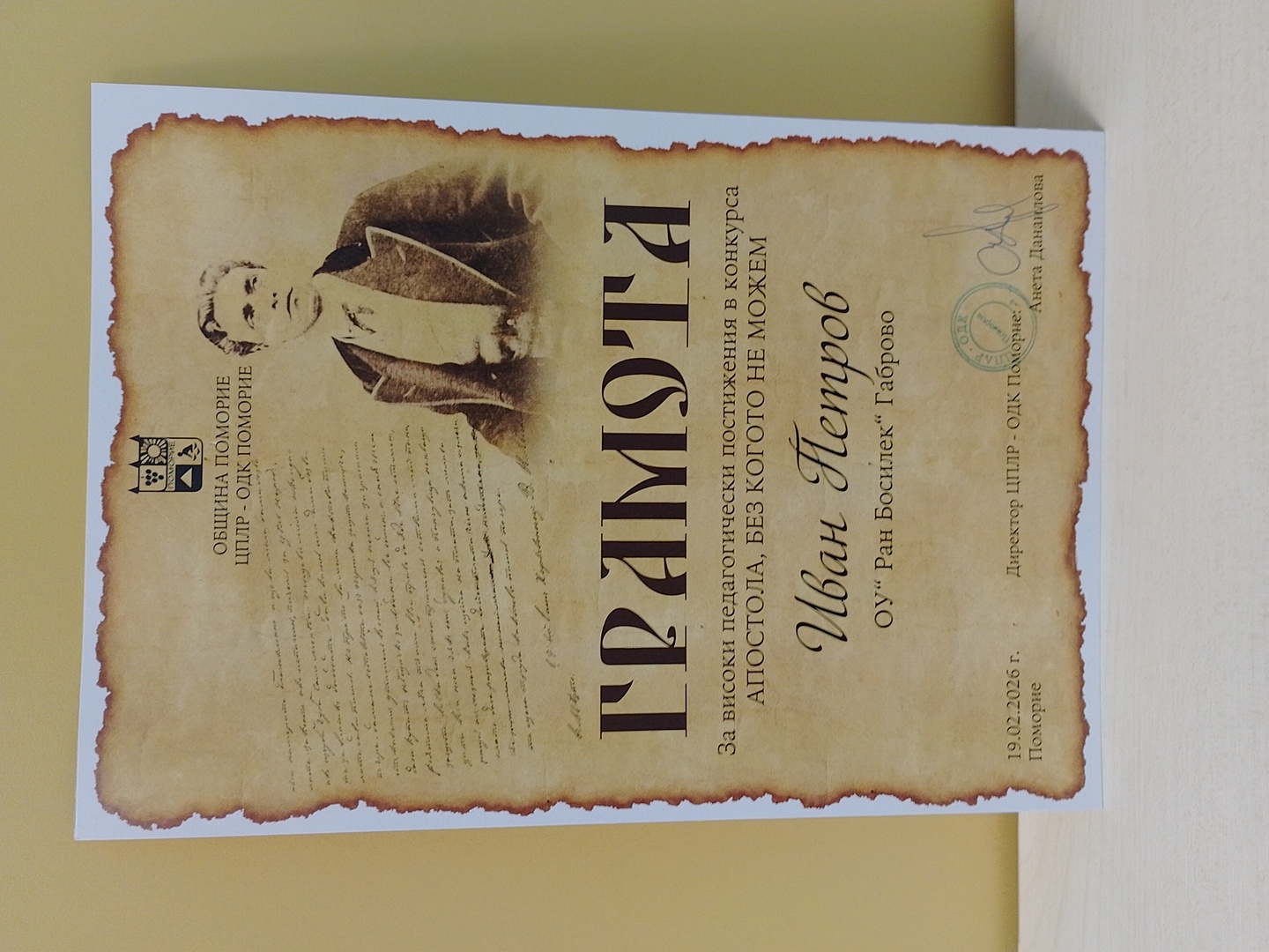 Подготовката на Никол беше осъществена под професионалното ръководство и вдъхновяващата подкрепа на нейния учител по история и цивилизации г-н Иван Петров. За своя всеотдаен труд и висок професионализъм той беше удостоен с грамота за постигнати високи педагогически постижения в подготовката на ученичката по темата на конкурса.