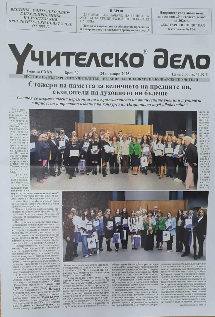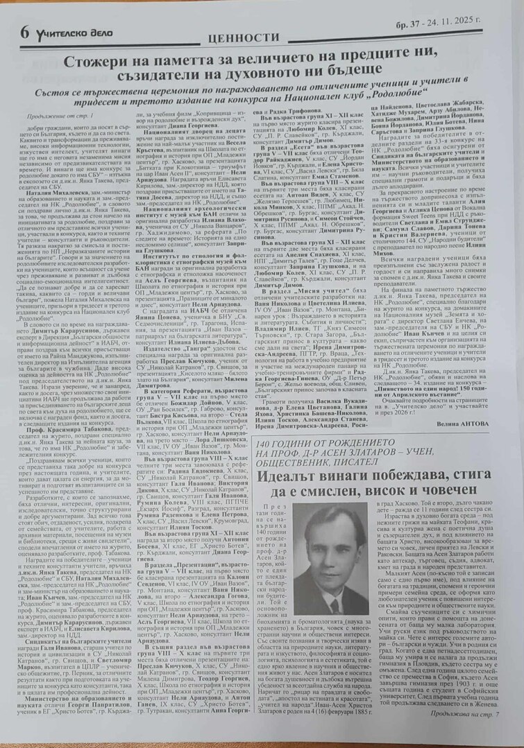 Този успех беше заслужено отразен и на национално ниво – вестник „Учителско дело“, бр. 37 от 24 ноември 2025 г., където сред отличените ученици и учители са и нашите представители. Това признание поставя достойно името на ОУ „Ран Босилек“ сред училищата, които изграждат будни, отговорни и мислещи млади хора.