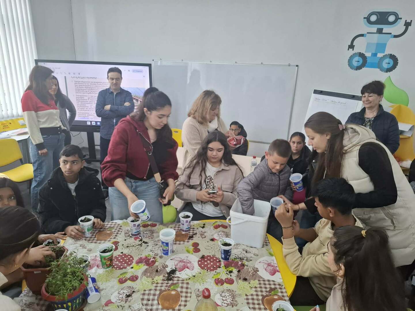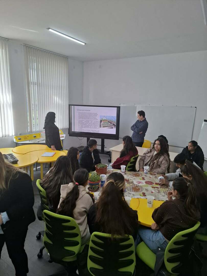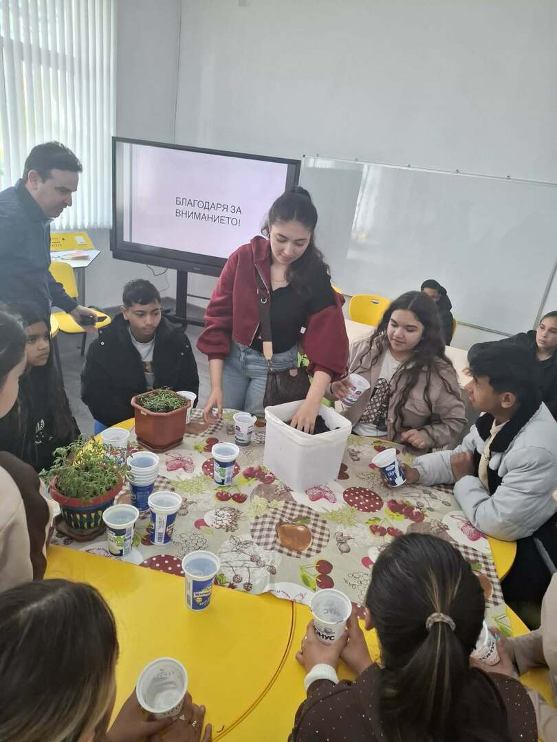 Гостите наблюдаваха интердисциплинарен урок на тема „Здравословен начин на живот", открит урок в начален етап – засаждане на семена от тиквички в опитното поле, и открит урок в прогимназиален етап – подготовка и пикиране на разсад от домати.